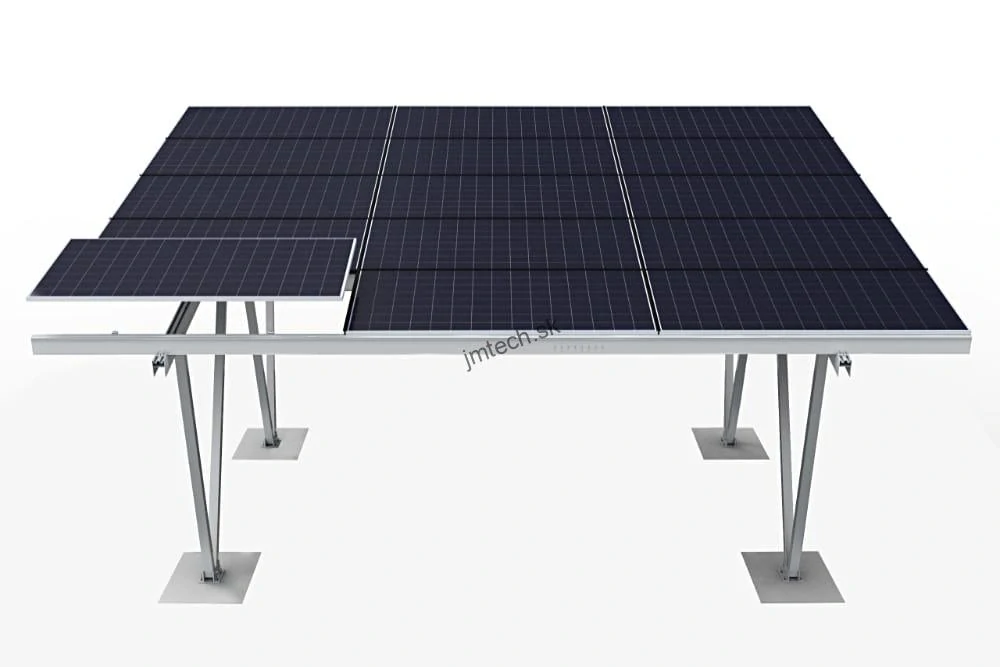 Hliníkový prístrešok pre autá s 2 stanicami a konštrukciou VV umožňuje horizontálnu inštaláciu 15 fotovoltaických panelov.